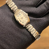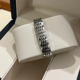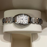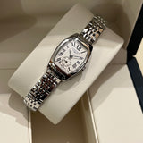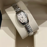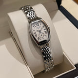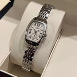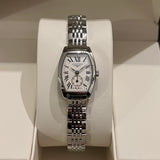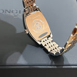 prečnik 19.60 mm * 23.30 mm. Veličina zgloba bez dodatnih veza: 13.8 cm. Kućište i narukvica od nerđajućeg čelika. Glatki okvir od nehrđajućeg čelika. Srebrni brojčanik sa rimskim brojevima. Safirno staklo. Kvarcni mehanizam. Poleđina kućišta od čvrstog nerđajućeg čelika sa Longines amblemom. Dvostruka preklopna kopča od čelika sa Longines amblemom.