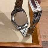Prečnik 38 mm. Obim ručnog zgloba 15 cm. Kućište od nehrđajućeg čelika. Glatki čelični okvir. Srebrni brojčanik bez brojeva. Svjetleće kazaljke i markeri. Pleksiglas staklo. Elektronski mehanizam sa zvučnom viljuškom. Kalibar 1260. Poleđina kućišta od punog nehrđajućeg čelika. Zamjenska narukvica od nehrđajućeg čelika (neoriginalna). Original. Omega Preklopna kopča od nehrđajućeg čelika.