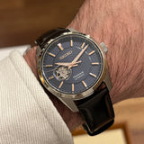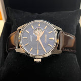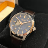 Prečnik 40 mm. Kućište od nehrđajućeg čelika. Glatki čelični okvir. Teksturirani plavi brojčanik bez brojeva. Kazaljke i markeri u zlatnoj boji. Safirno staklo. Automatski mehanizam. Prozirna poleđina kućišta. Originalna smeđa koža. Seiko remen. Kopča na raspolaganje sa Seiko amblem.